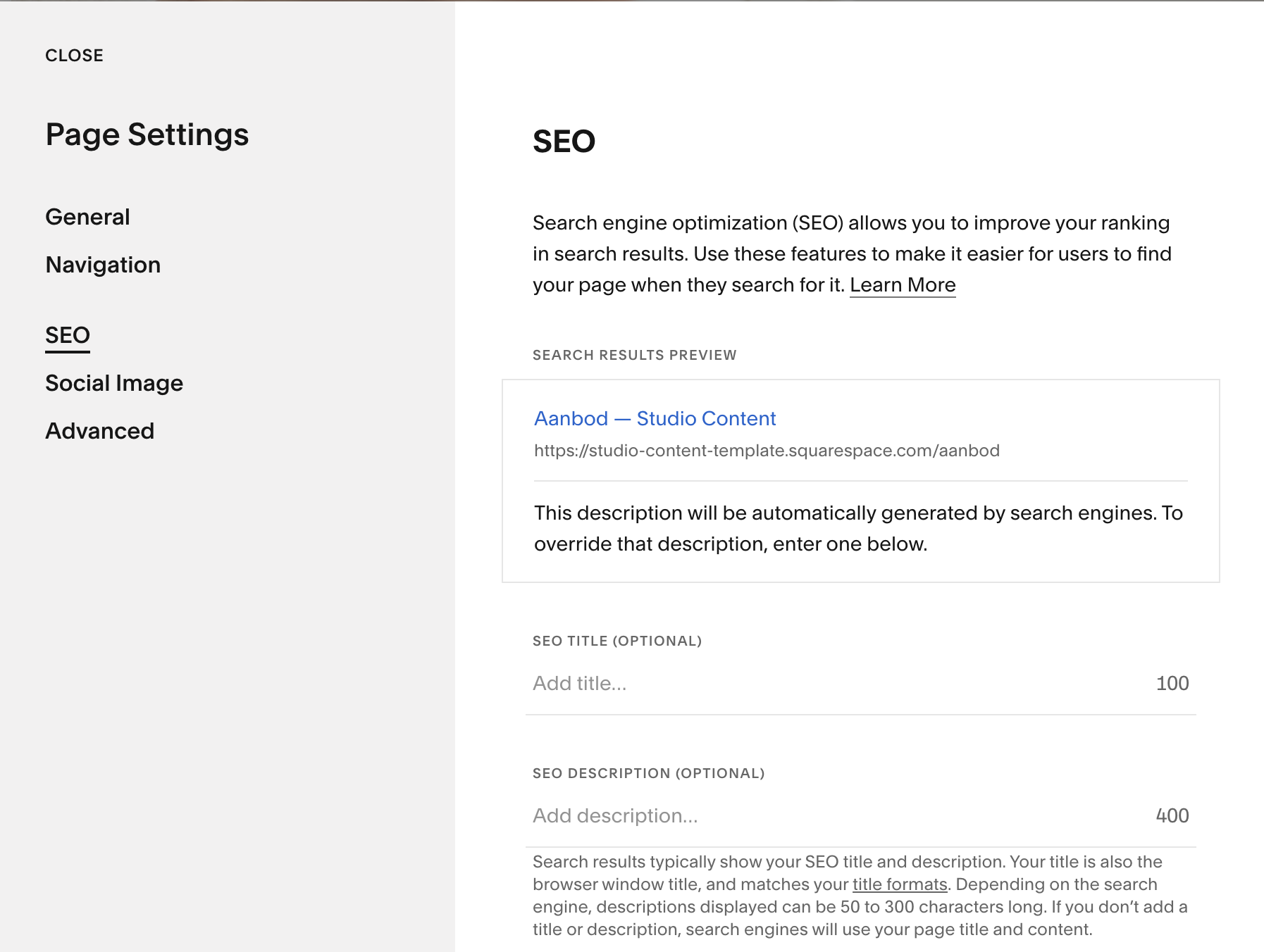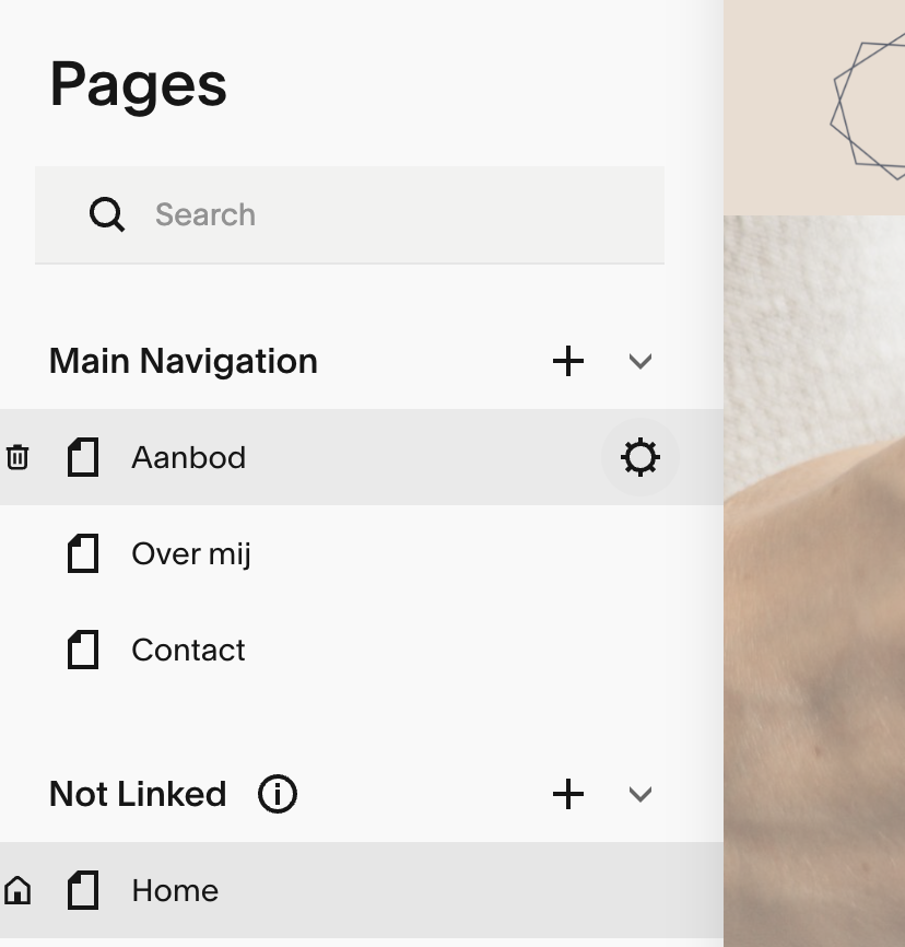 Kijk in de Squarespace backend van je website bij Pages. Klik op het tandwieltje naast de pagina waarvoor je de metadata wil aanvullen. In de Page Settings voeg je de metatitel en de metabeschrijving voor de pagina toe.