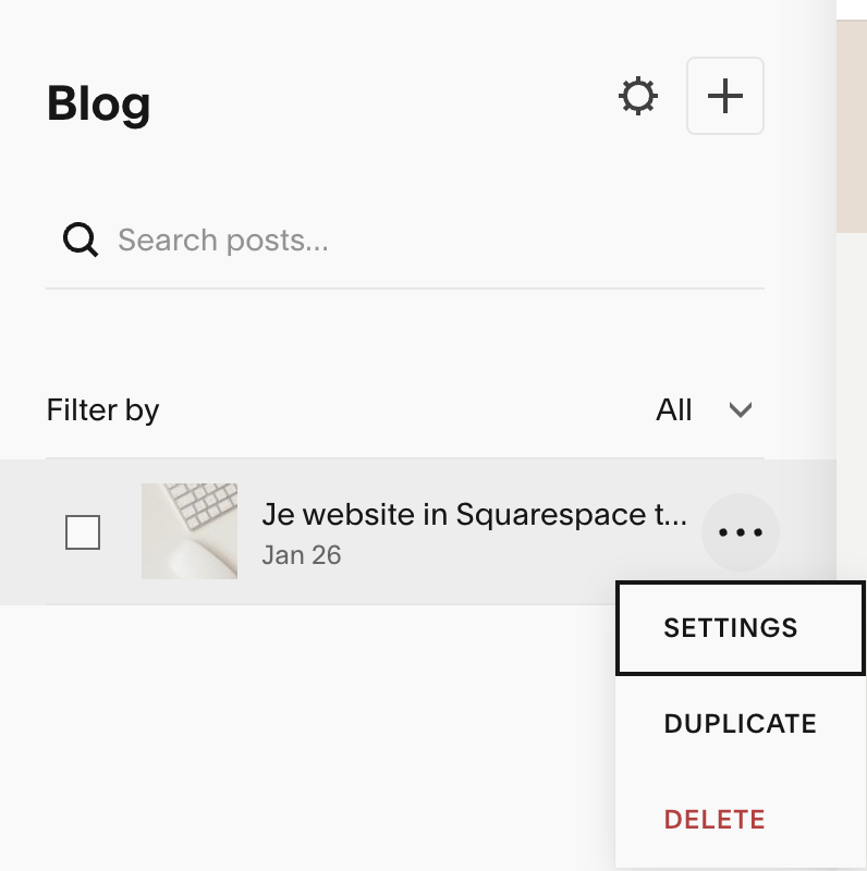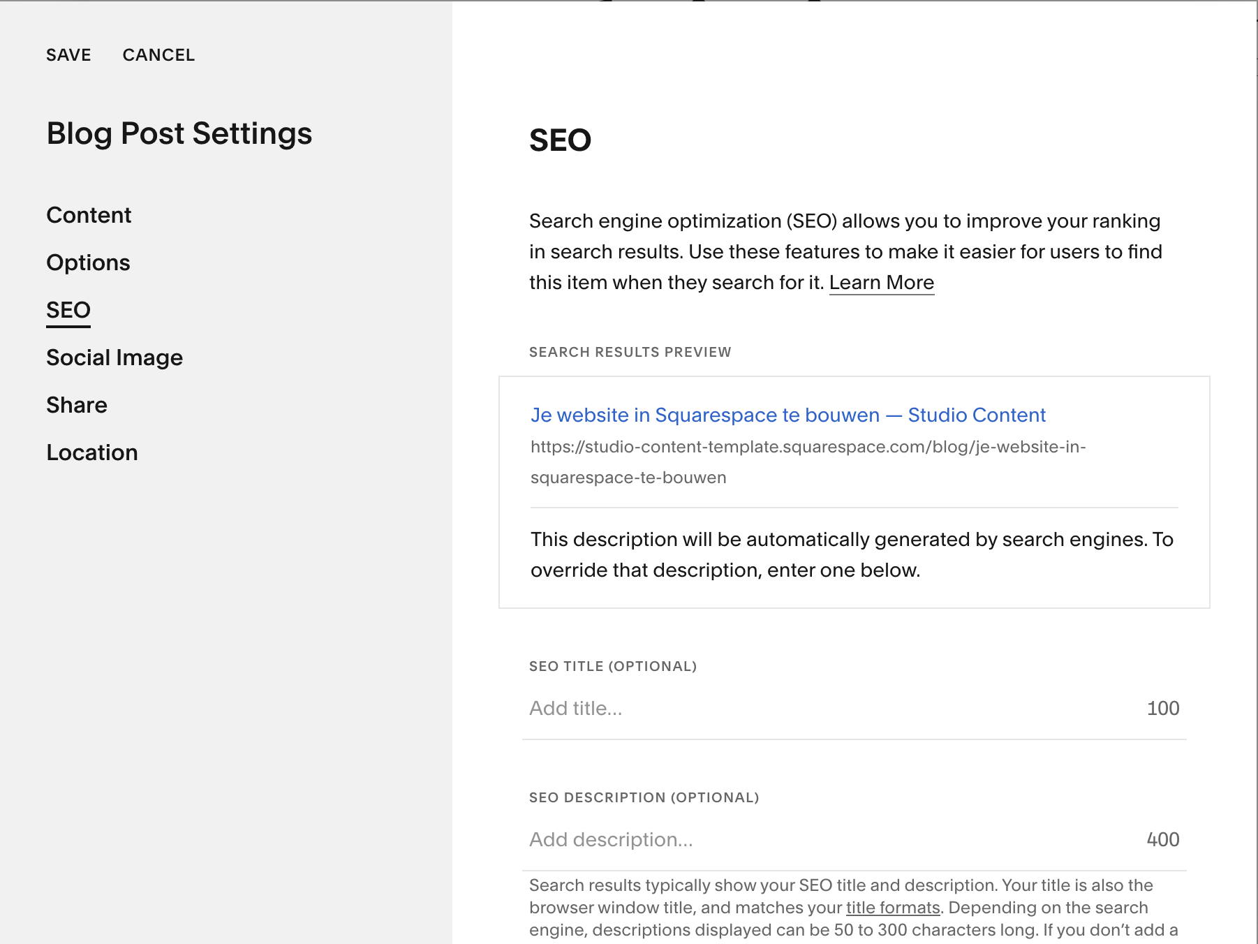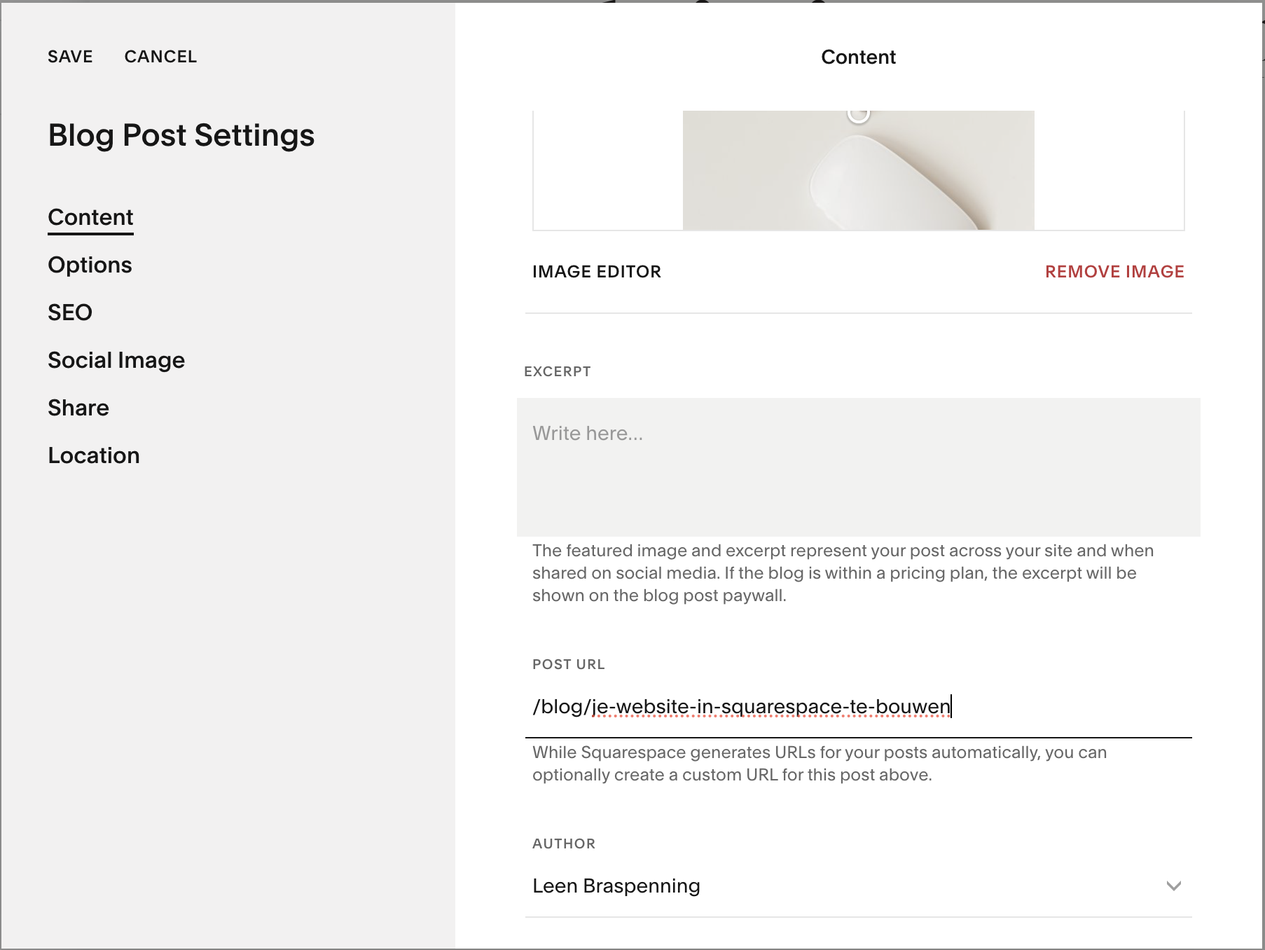 Navigeer naar de instellingen (settings) van je blog via de 3 puntjes. Kijk bij “content” eerst de URL na. Squarespace stelt die standaard zelf in, maar kiest meestal voor iets nietszeggend. Aan jou om de URL in te zetten om de inhoud van de blog duidelijk te maken aan je doelgroep. Kijk als voorbeeld naar de URL van deze blogpost. Het laatste deeltje of de slug verklapt meteen waarover de blog gaat, namelijk SEO voor Squarespace websites.