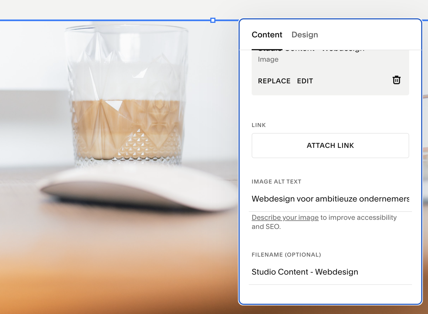 Kies voor elke pagina afbeeldingen die de boodschap van je tekst versterken. Voor SEO zijn de bestandsnaam en de ALT text belangrijk. Om die aan te passen, dubbelklik je op de afbeelding. Je krijgt nu de kans om de “image ALT text” en de “filename” aan te passen.