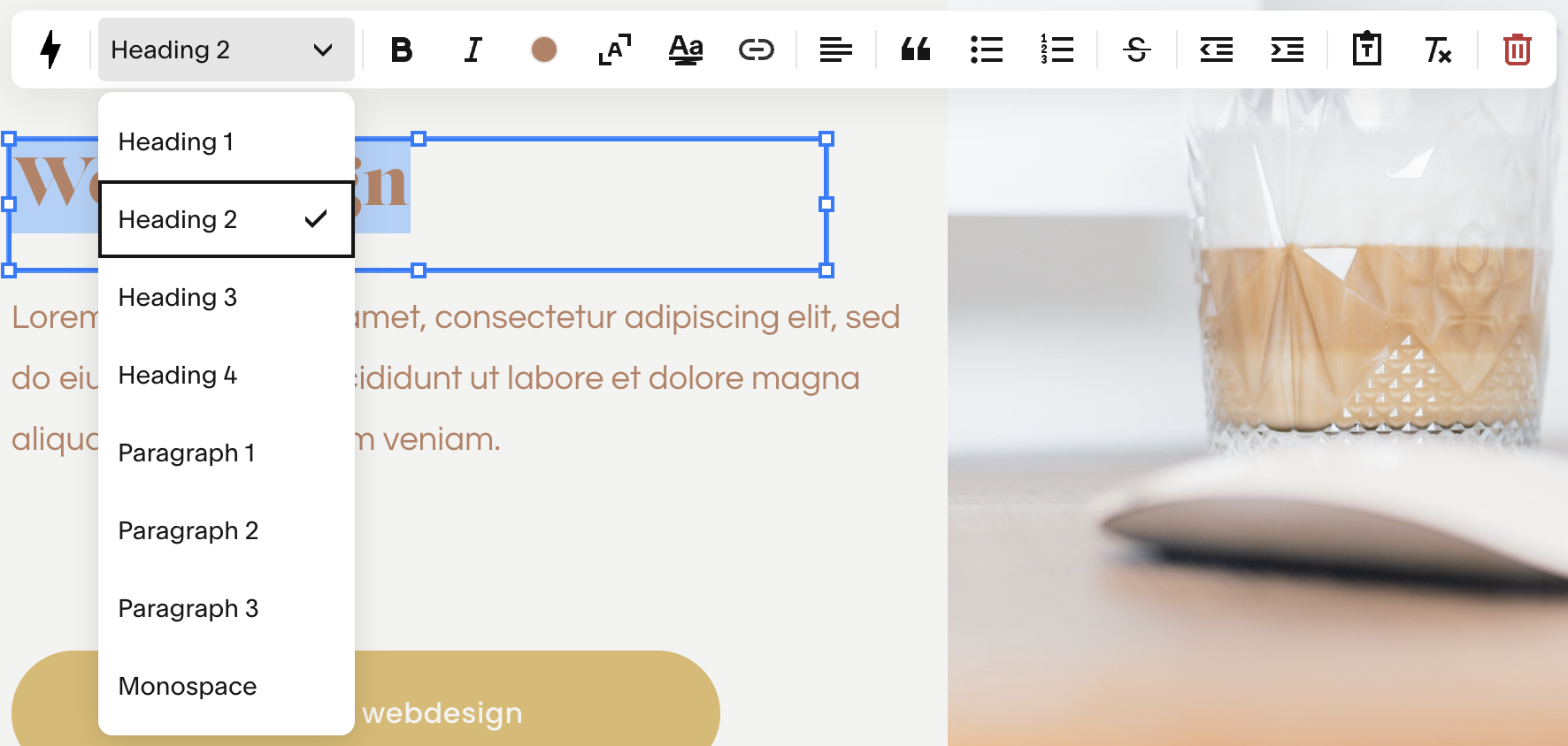 Om je titels de juiste waarde te geven, selecteer je de tekst van de titel. Meteen verschijnt de opmaakbalk met de verschillende mogelijkheden.